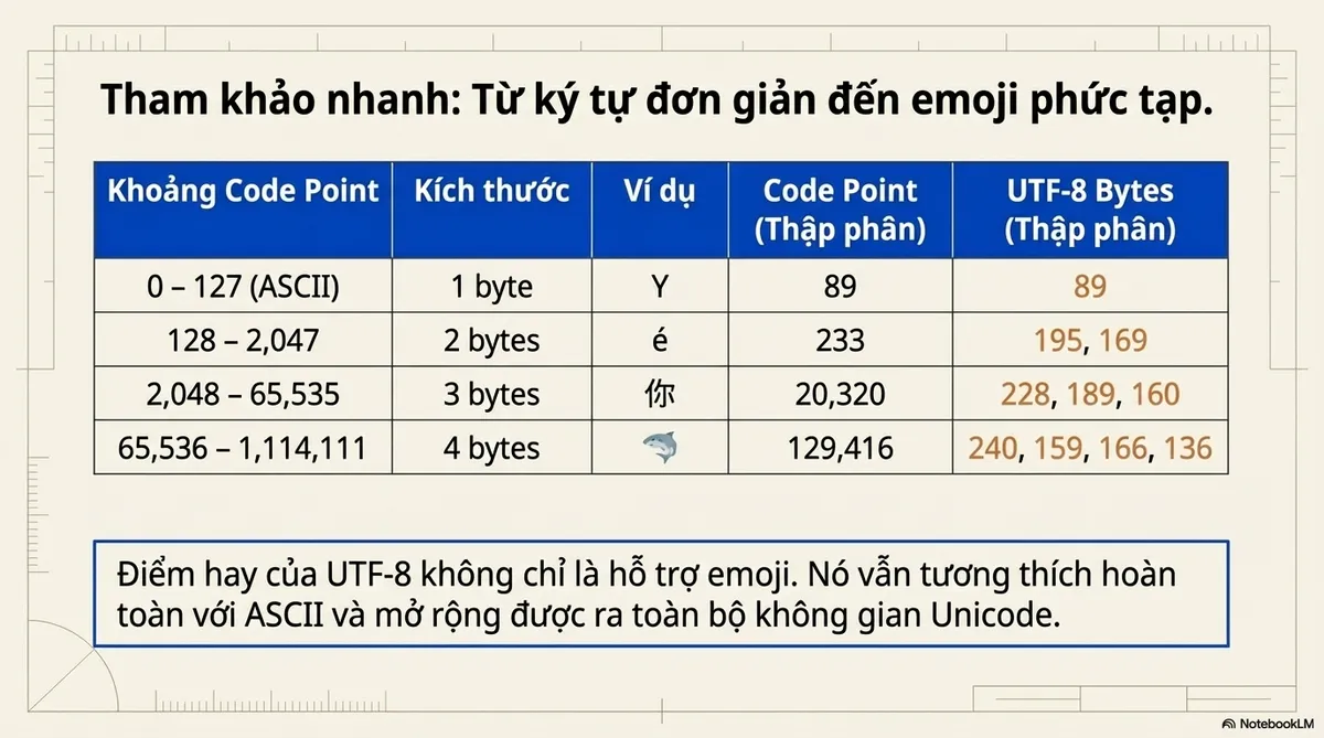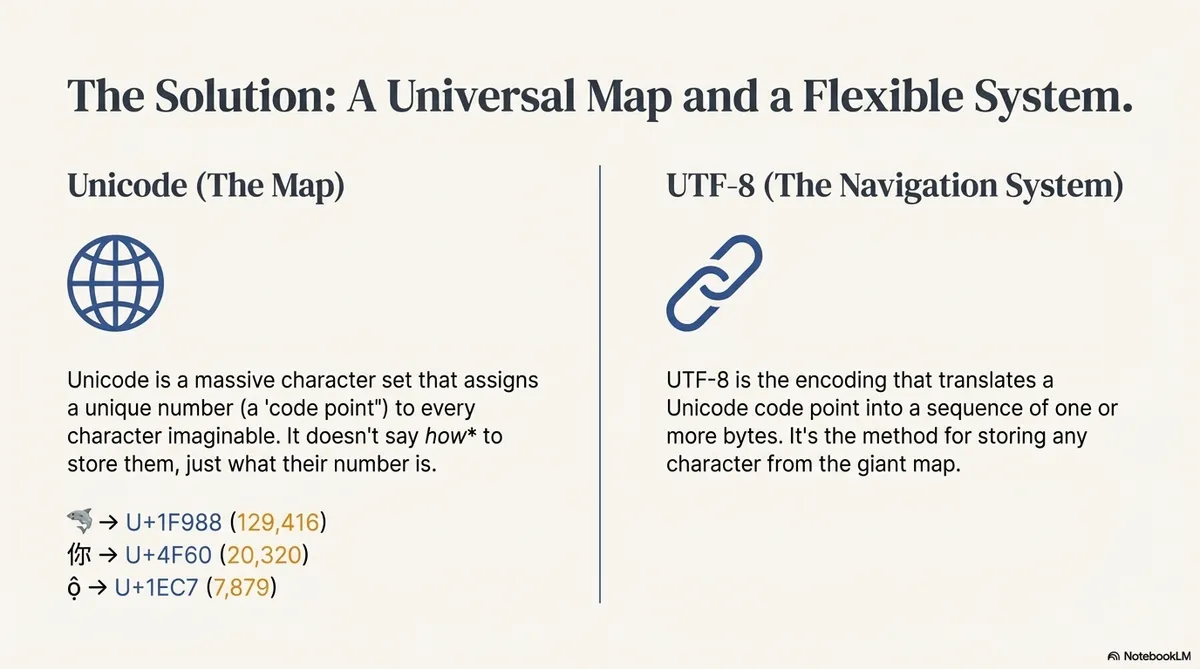 The takeaway: UTF-8’s genius isn’t just that it supports emojis. It stays compatible with ASCII and scales to the entire Unicode space.