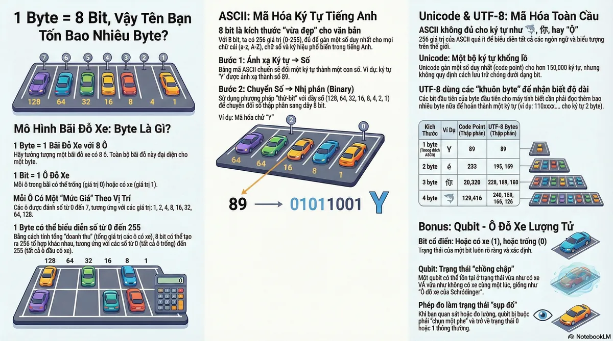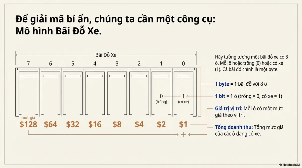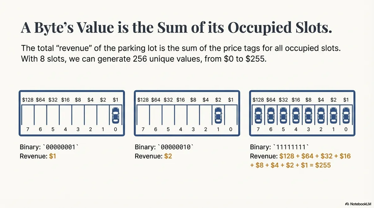 Picture a parking lot with 8 slots. Each slot is either empty (0) or has a car (1). That whole lot is a byte.
