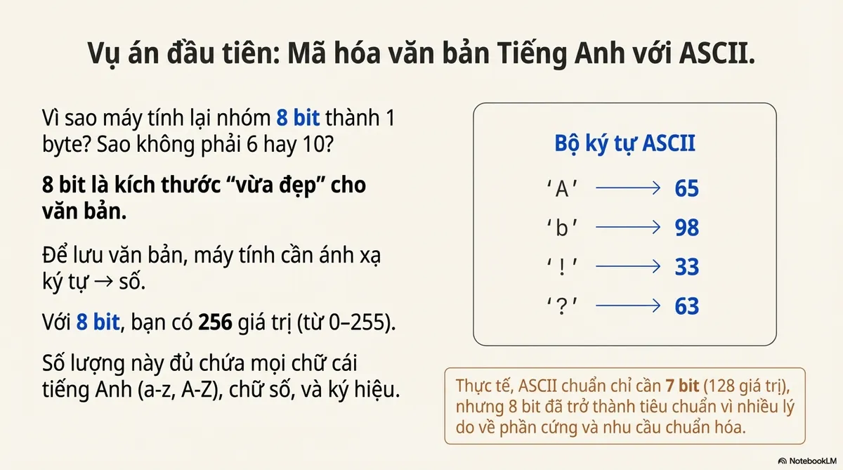 To store text, computers need to map characters to numbers. With 8 bits, you get 256 slots (0–255). That’s enough space for every English letter (a-z, A-Z), number, and symbol, with room to spare.