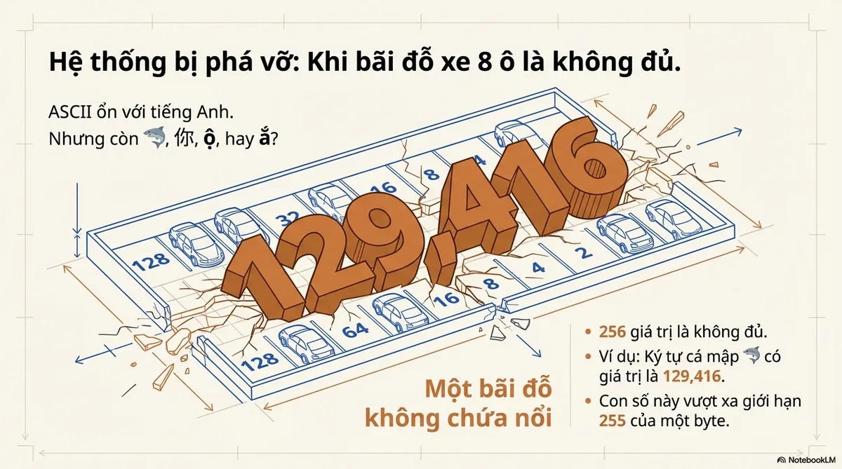 But 🦈 is 129,416. That’s way beyond 255. One parking lot (one byte) can’t hold it.
