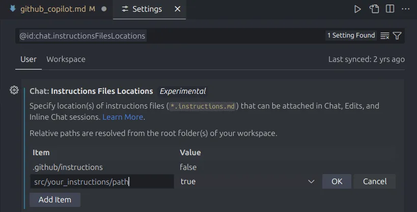 | Chat behavior | chat.instructionsFilesLocations - These instructions influence Copilot’s conversational style and how it responds to your queries in the chat interface. You can set its persona, verbosity, or preferred tone. |