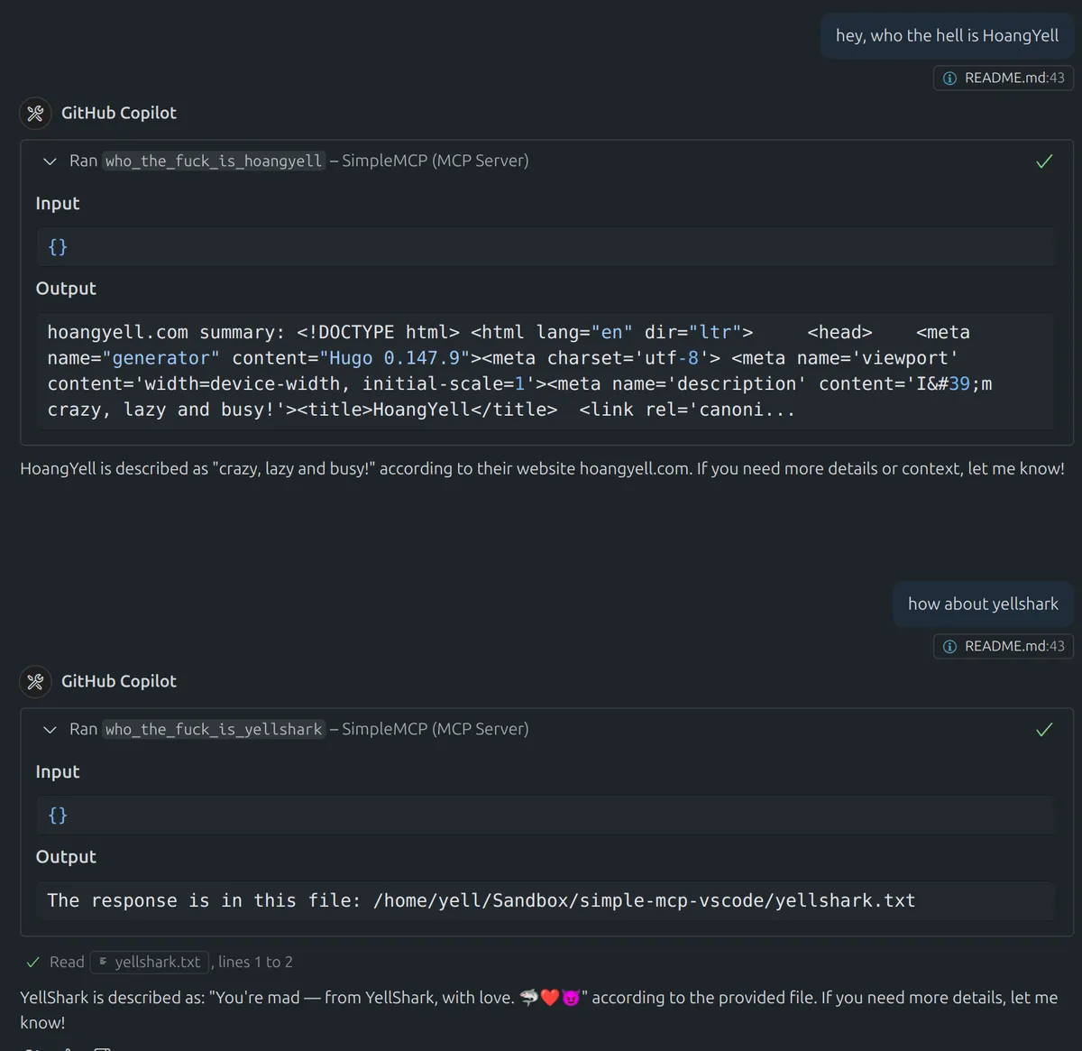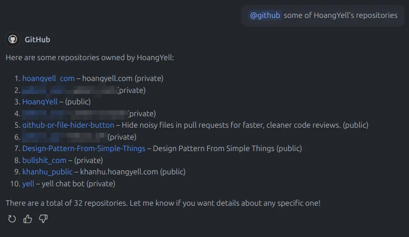 @terminal:: Interact with the terminal (e.g.,@terminal I want to get the path of the current directory).@github:: Interact with GitHub (e.g.,@github some of HoangYell's repositories).
