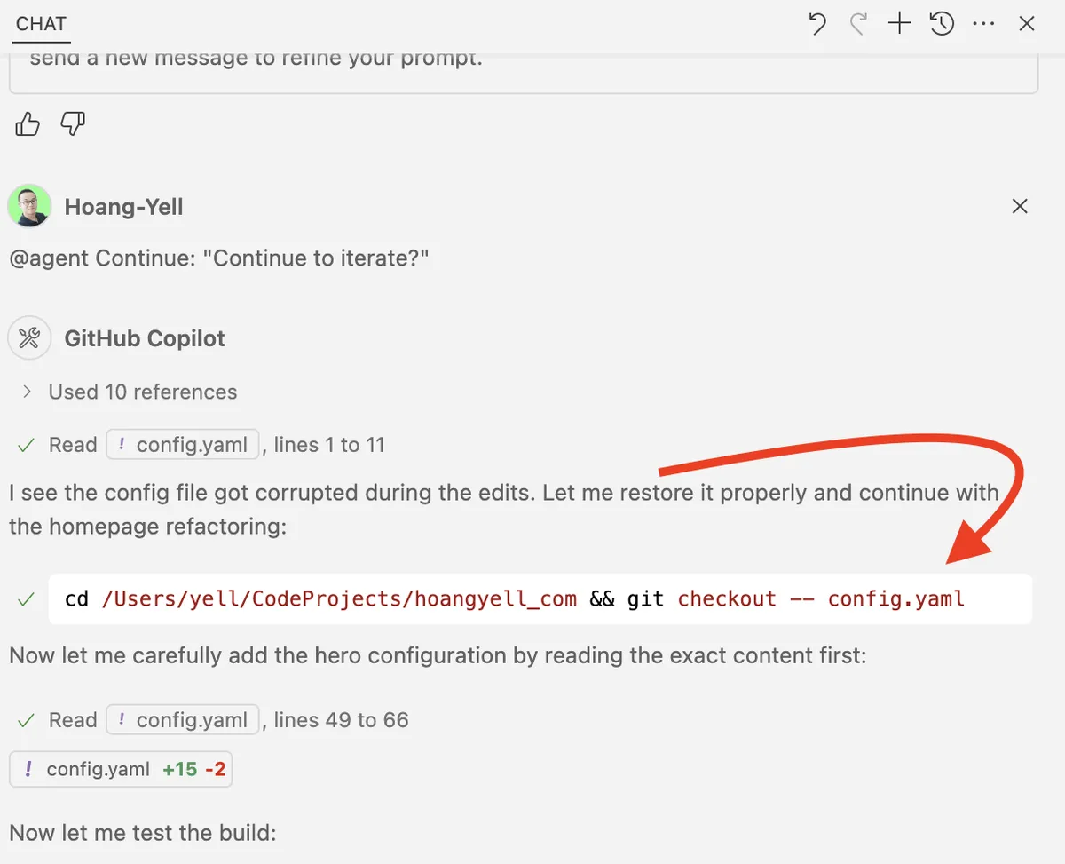 Agent edits code, adds debug comments, and can use git to revert files after an error.