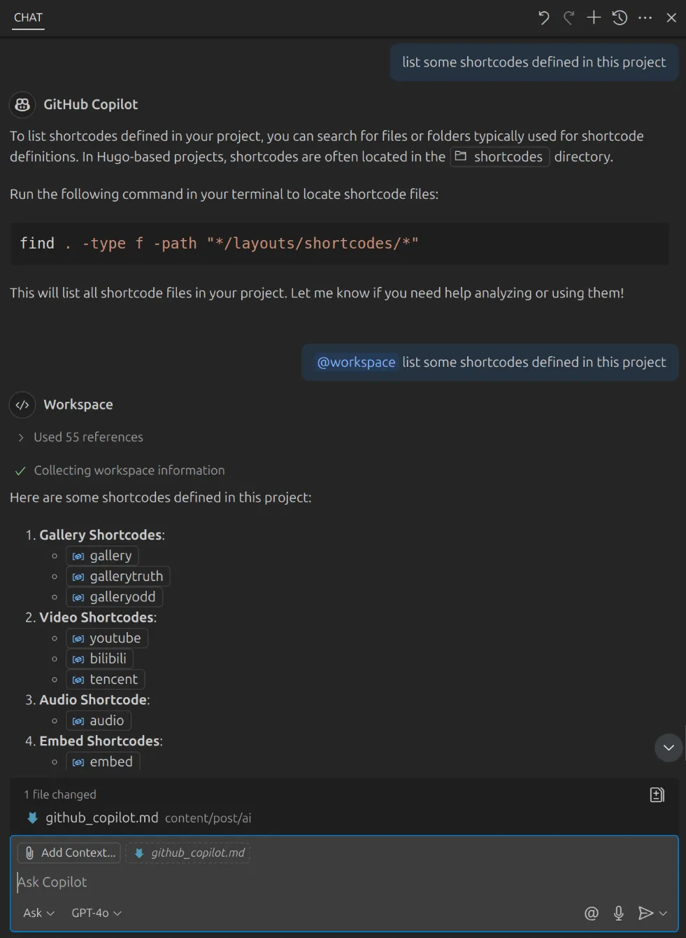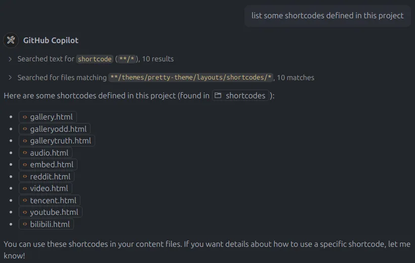@scope_name): For broader context, especially in Ask/Edit Mode, use@scope_nameat the beginning of your prompt:@workspace:: Refers to your entire project, allowing Copilot to understand the context of your codebase (e.g.,@workspace list some shortcodes defined in this project?). This is often the most powerful scope in Ask Mode.