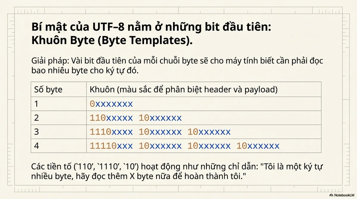 Các tiền tố (110, 1110, 11110) nói với máy tính: “Tôi là ký tự nhiều byte, hãy đọc thêm X byte nữa.”