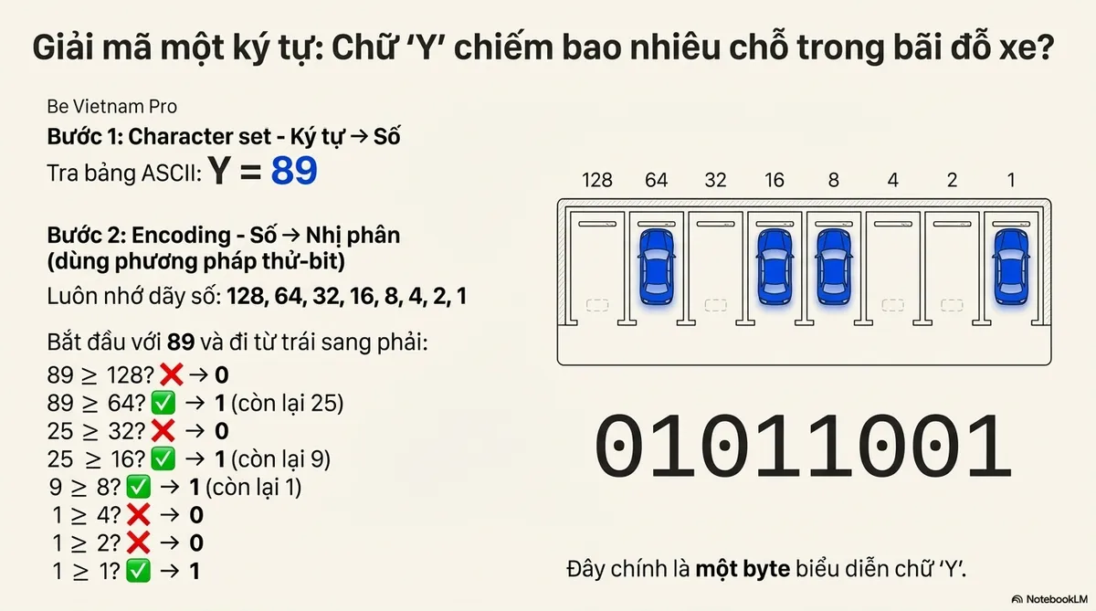 Hãy tưởng tượng một bãi đỗ xe có 8 ô. Mỗi ô hoặc trống (0) hoặc có xe (1). Cả bãi đó chính là một byte.