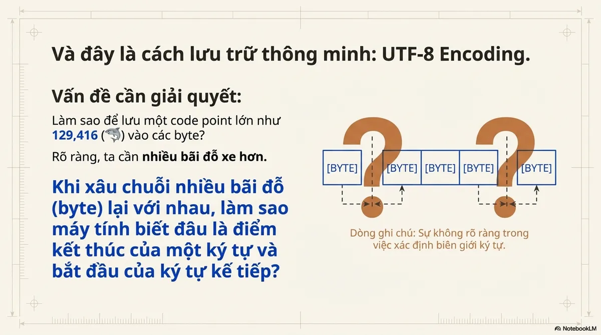 Phần “encoding” (lưu bằng byte ra sao)? Đó là lúc UTF-8 xuất hiện.