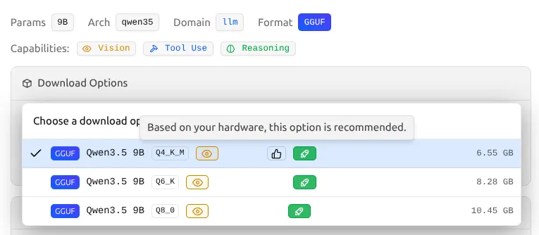 Luôn săn badge tên lửa xanh. Nếu model không hiện biểu tượng này, hãy chọn quantization nhỏ hơn hoặc model nhỏ hơn.