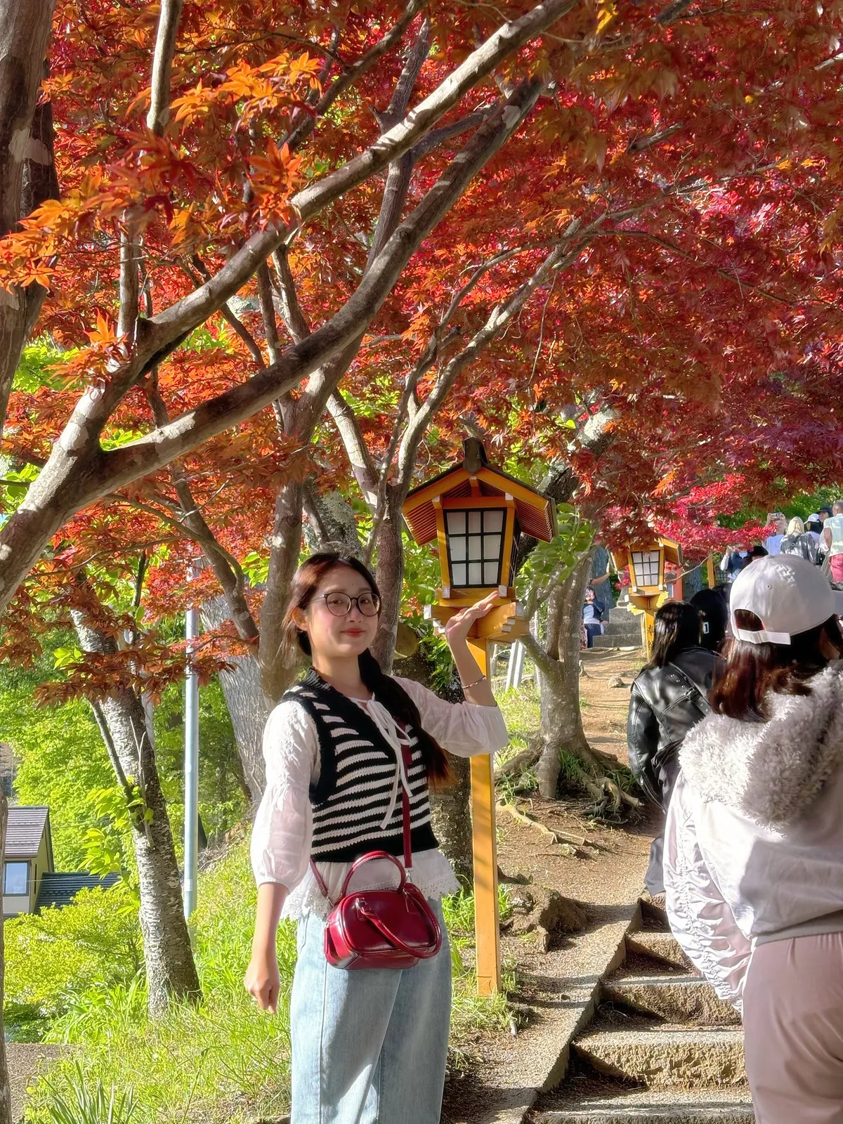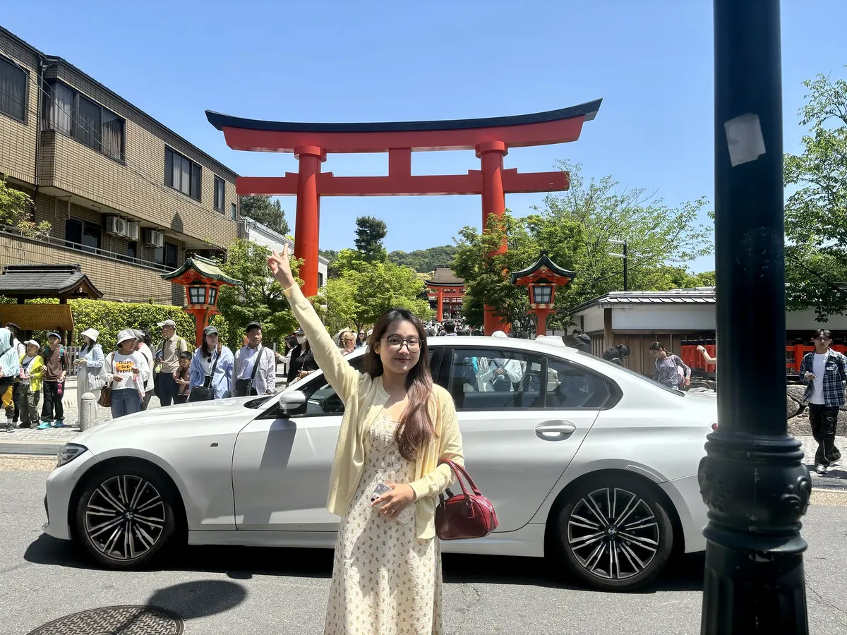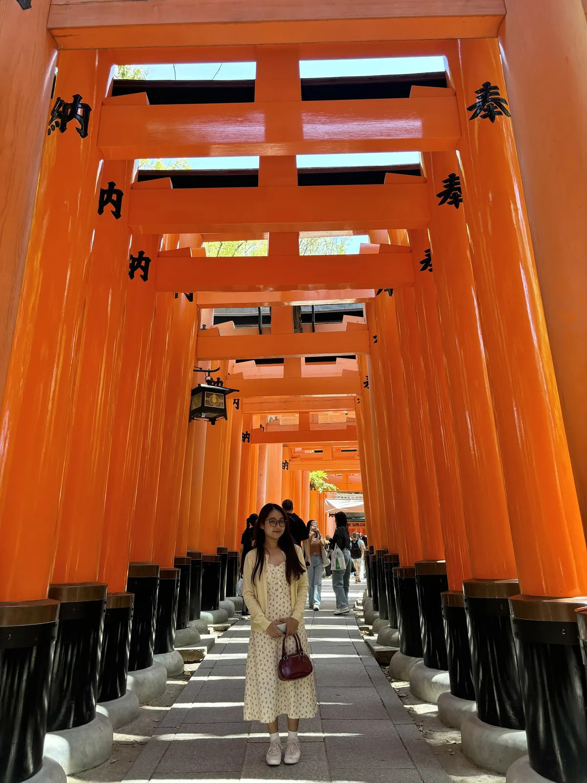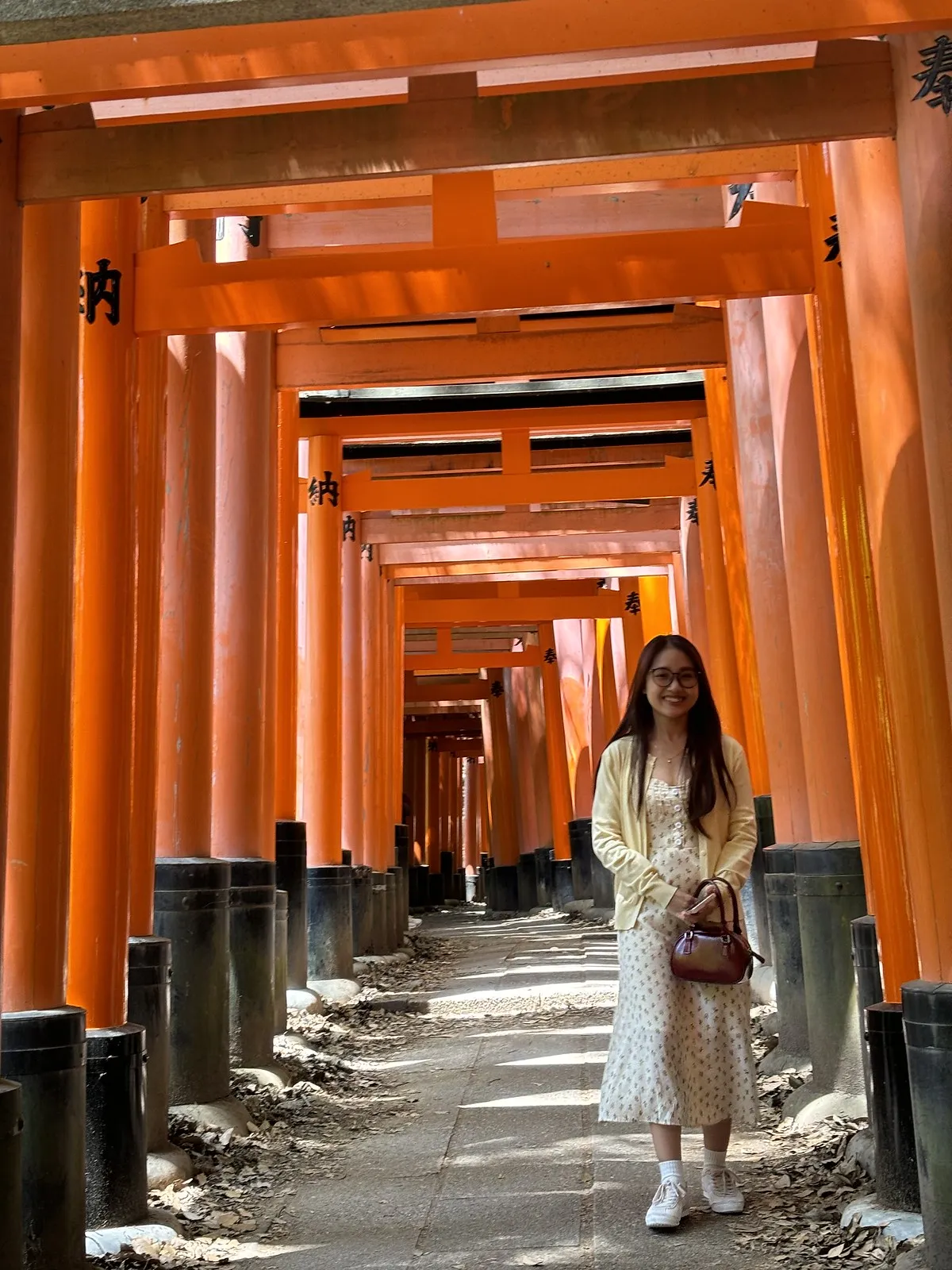 Lịch trình buổi chiều: Đền Fushimi Inari – cái đền có cả tỷ cổng torii màu đỏ ấy. Biểu tượng thì có biểu tượng đó, nhưng cũng là một bài tập thể dục tốn calo ra phết. Sau khi đi qua không biết bao nhiêu cái cổng, chân cô ấy như muốn rụng rời (nhưng lên hình thì vẫn đẹp chán). Còn tôi thì trông như thằng cần một giấc ngủ ngay và luôn.