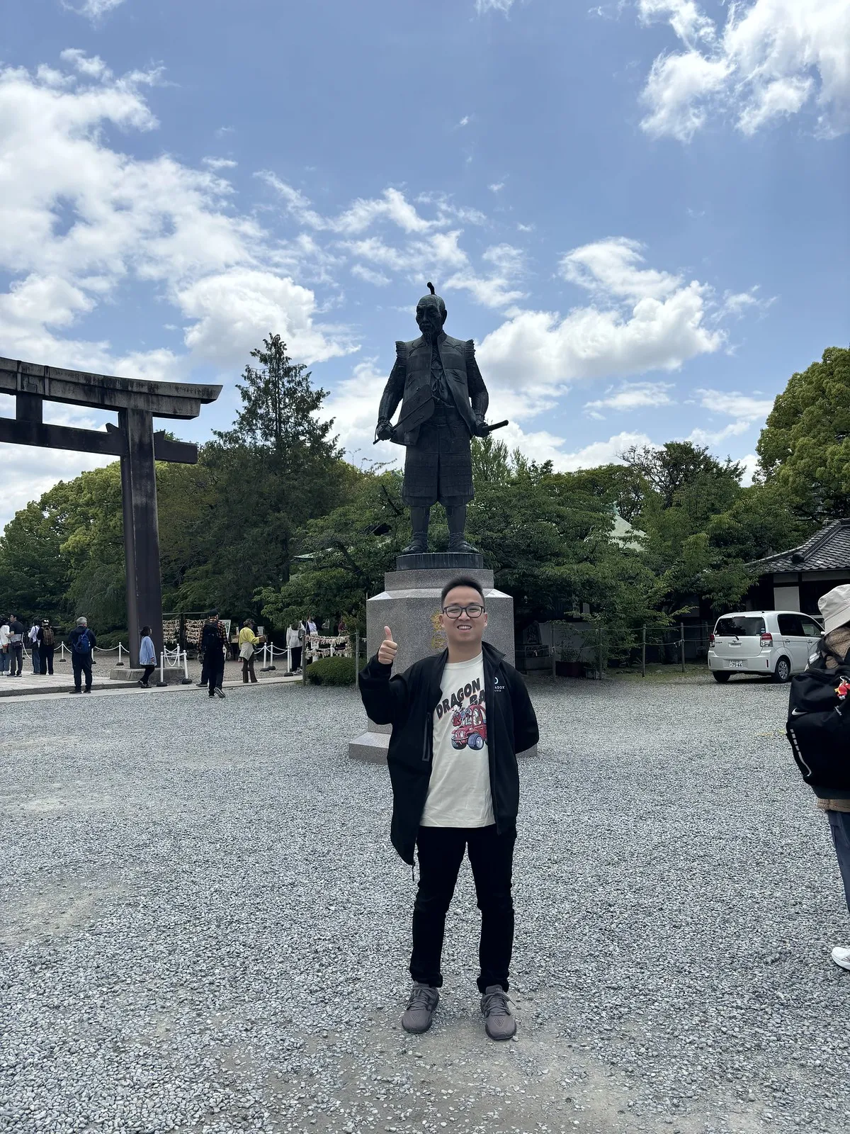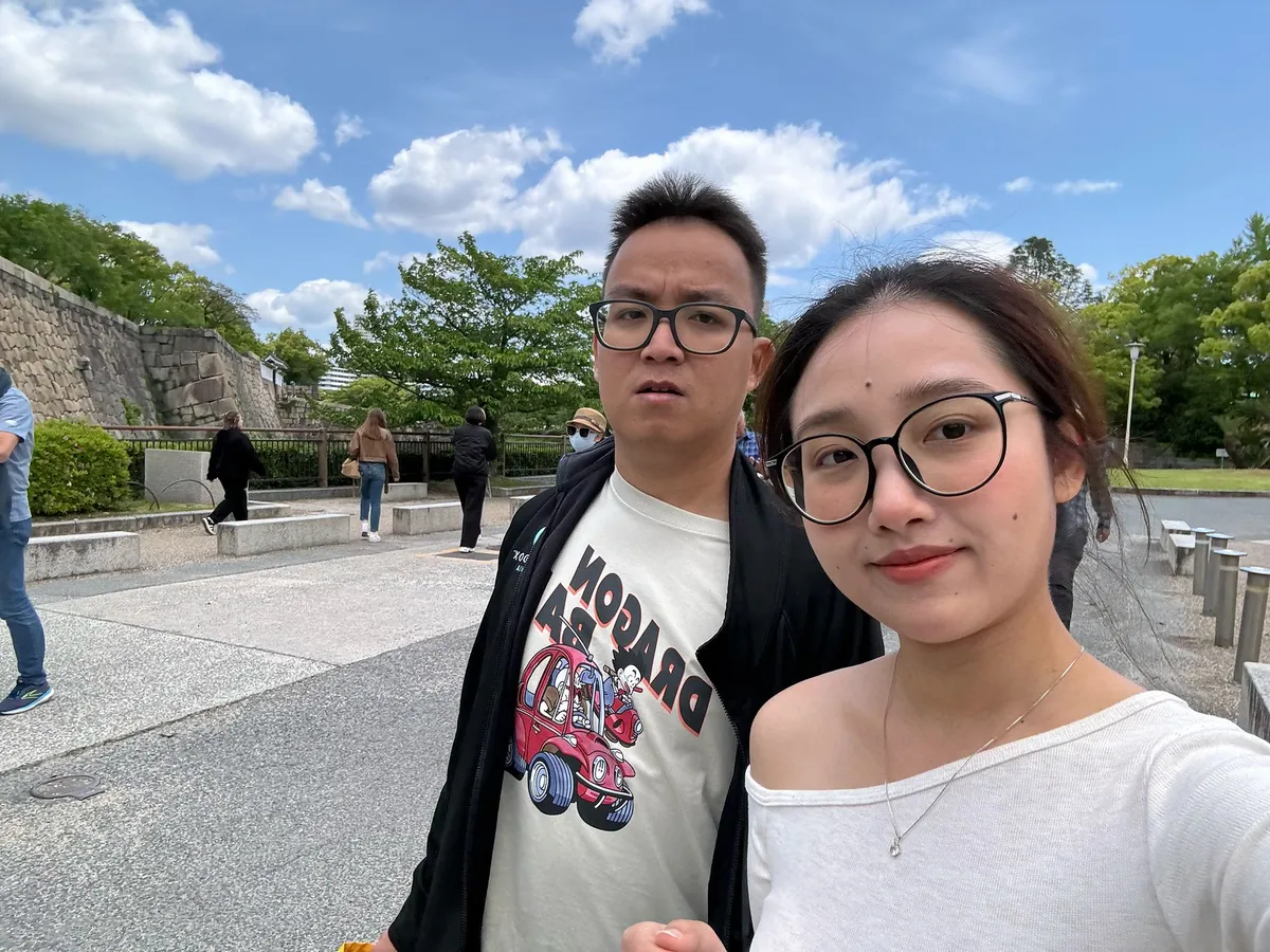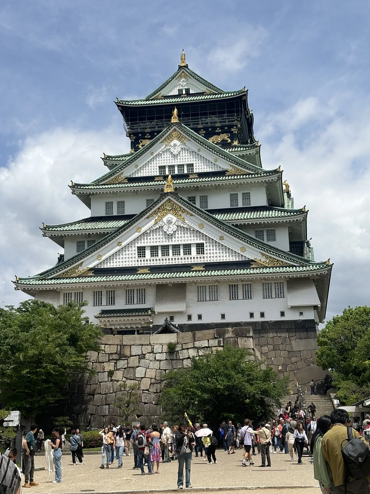 Điểm dừng chân đầu tiên: Lâu đài Osaka. Uy nghi, lịch sử, bla bla bla. Với lại, mặt trời lúc đó đang cố gắng thiêu cháy võng mạc của tôi. Tụi tôi chụp mấy tấm hình check-in theo nghĩa vụ, nheo mắt một cách anh hùng, rồi té lẹ đi tìm bóng râm. Nắng thấy mụ nội.